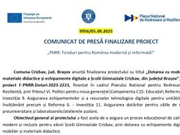 COMUNICAT DE PRESĂ FINALIZARE PROIECT „PNRR: Fonduri pentru România modernă și...
